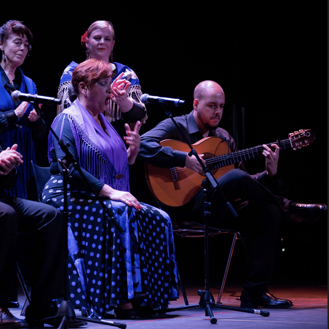 Katie began learning palmas with La Chivis in San Miguel de Allende in the winter of 2020 and has studied cante with professional singer Marcos Martínez in Seville, also through Arte Arrebol. She has participated in the Curso Internacional del Flamenco in La Puebla de Cazalla and Málaga in 2018, 2022, 2023, and 2024, respectively.